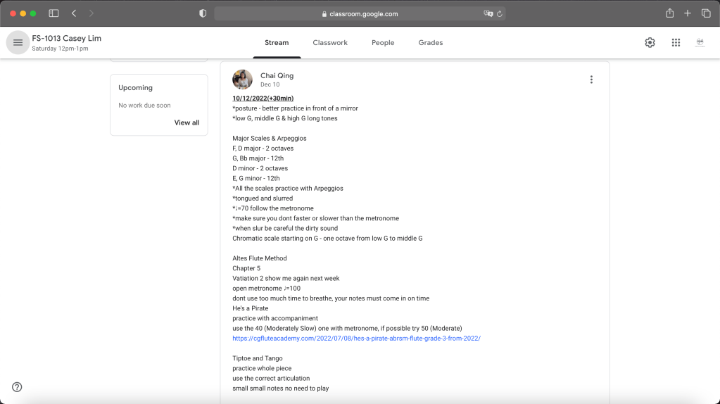 We use google classroom to keep track each lesson’s feedback and homework, student can always check the comments teacher wrote in order to practice effectively. Parents are added into the same google classroom to monitor the progression together with teacher.