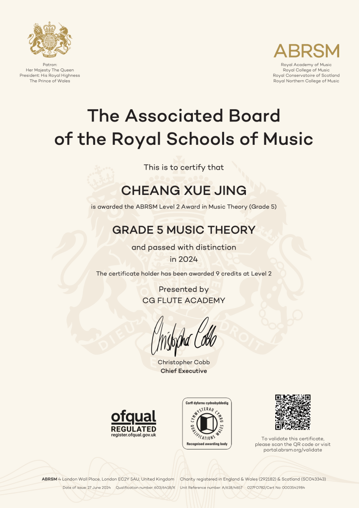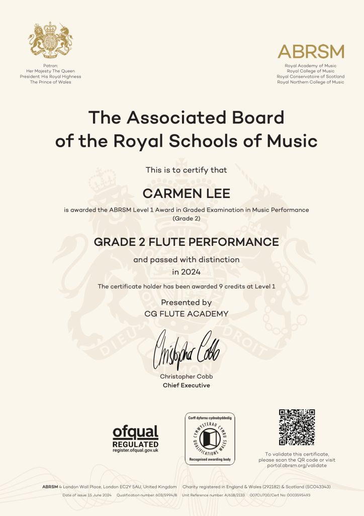 ABRSM Grade 2 Flute Performance passed with Distinction in 2024