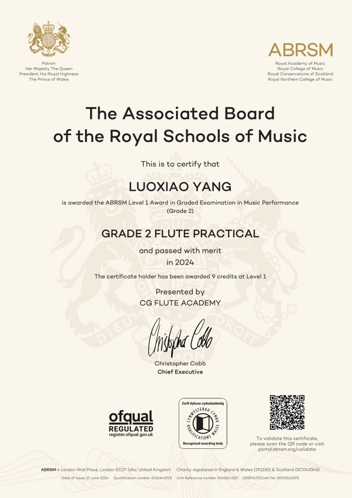 ABRSM Grade 2 Flute Performance passed with Merit in 2024