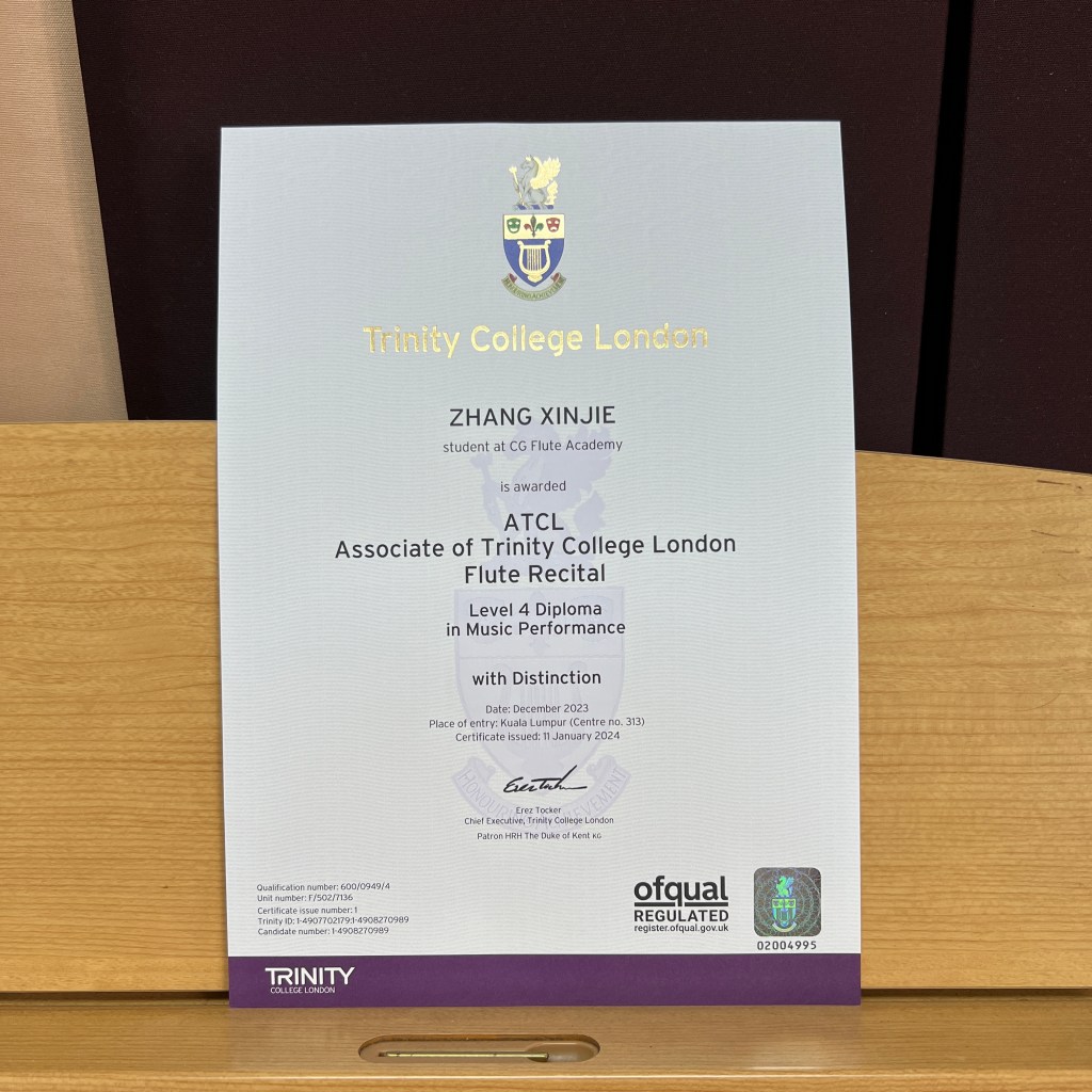 Trinity ATCL Flute Recital passed with Distinction in 2023