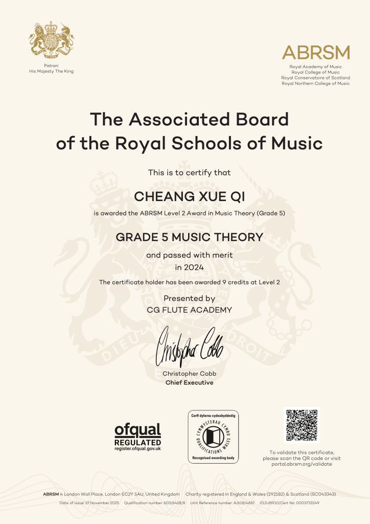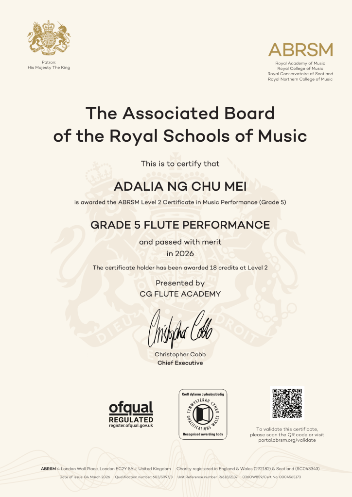 ABRSM Grade 5 Flute Performance passed with Merit in 2026
