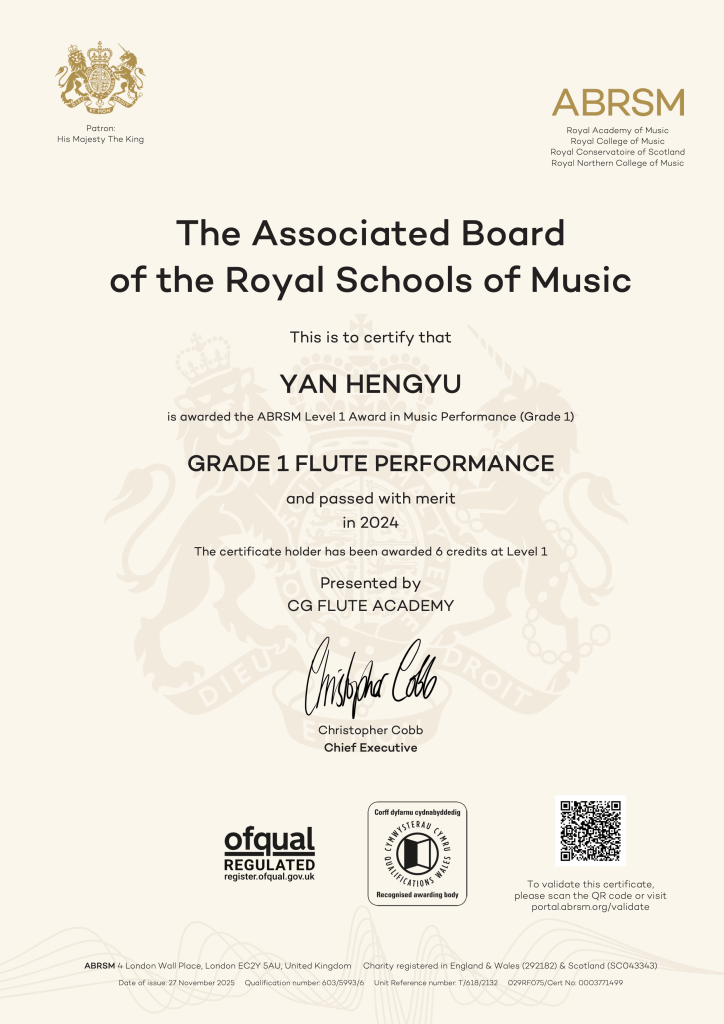 ABRSM Grade 1 Flute Performance passed with Merit in 2024
