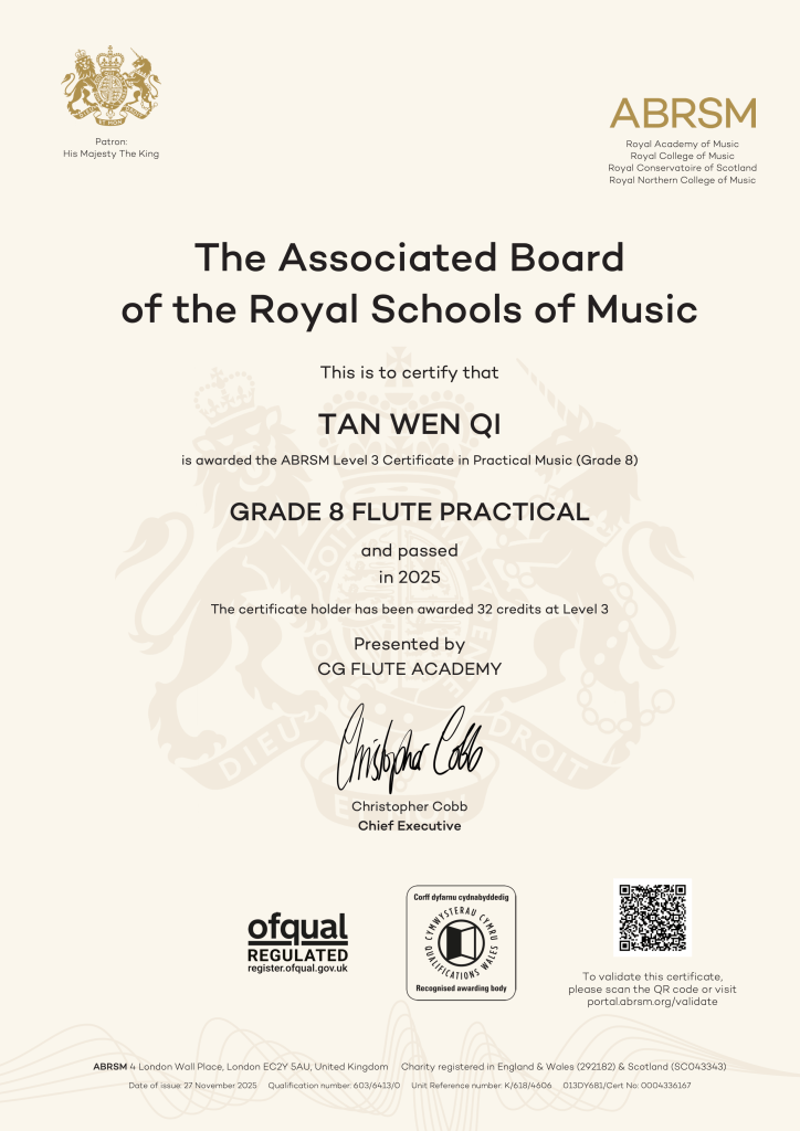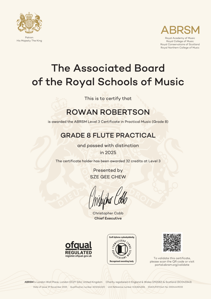 ABRSM Grade 8 Flute Performance passed with Distinction in 2026