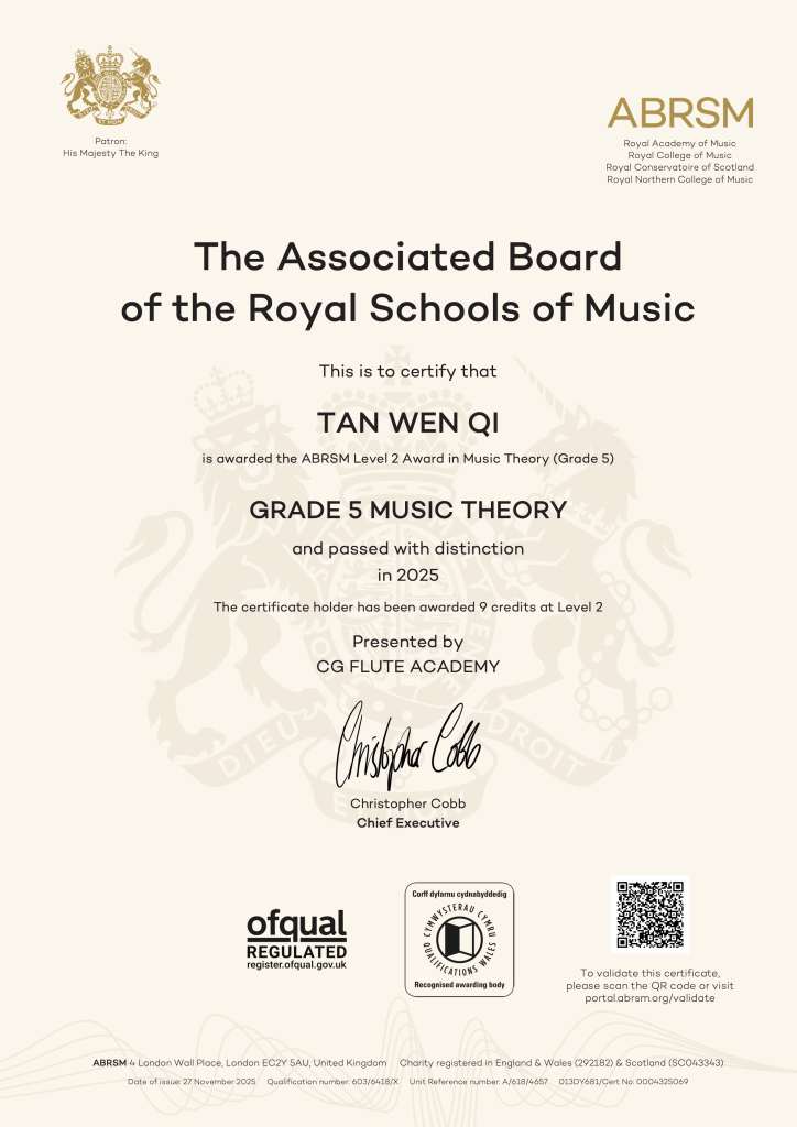 ABRSM Grade 5 Flute Practical passed with Distinction passed in 2025