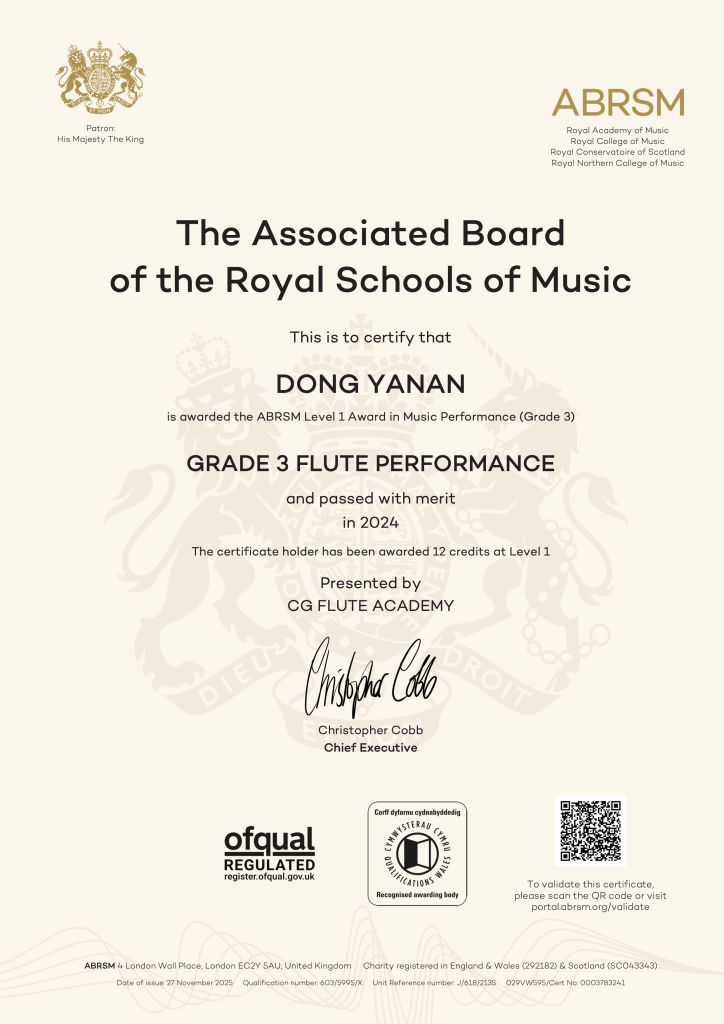 ABRSM Grade 3 Flute Performance passed with Merit in 2024