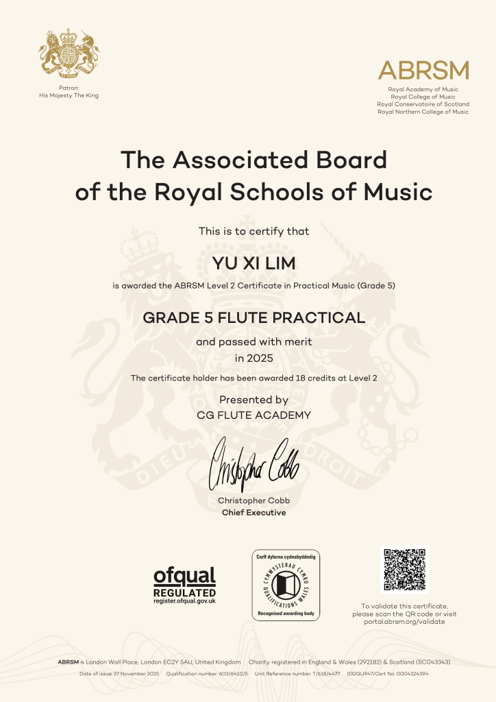 ABRSM Grade 8 Flute Pratical passed with Merit in 2024
