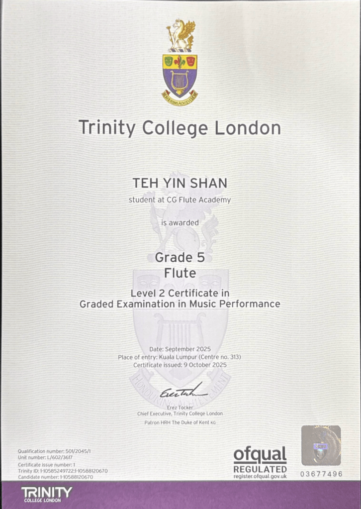 Trinity ATCL Flute Recital passed with Distinction in 2023